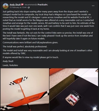 I have 23 years of modelling experience, flying helicopters, competing in F3J/F3B, some F3F and Dynamic Soaring, I hold many site speed records, design and make my own composite models. I am the designer of the TJIRC Magnus and Tempest. With my experience I can supply a professional build service for gliders. The build/install service I provide is for composite models, I do not assemble wooden kits. When a service is agreed, and your model is sent to me it will undergo an external inspection on delivery and I will inform you immediately of any visible damaged caused by post and send pictures as required.I will work based on first come first serve and will work on one project/model at a time until it is complete so, please feel reassured that you will get a professional service completed in a timely manner. Please allow me 2 weeks to carry out the work unless stated otherwise, you will be informed if I cannot make the deadline due to unforeseen circumstances. Good communication is paramount to me.I have access to my own CNC and manual machines so I can make custom parts like G10 control horns/motor mounts, RX/servo trays, aluminium /steel location pins.I only use high quality epoxy glue to secure servos for example.