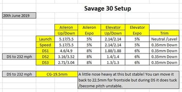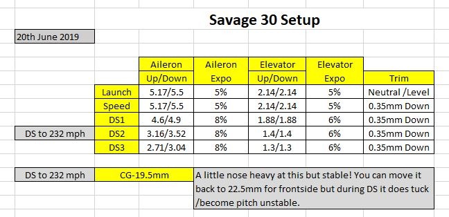 This setup is what I use for my personal models and is recommended for normal slope soaring and Dynamic Soaring. Please adjust this base setup more or less to suite your flying style. The wing control surfaces should be set level for launch and down 0.35mm for fast flying. Once the CG is perfect the ‘Savage’ should not pull out of a dive and require a slight bit of down Elevator when inverted. Please alter this as you wish for personal preference. Note* moving the CG too far back will cause the model to pitch up and down and will start to tuck and/or pitch up.